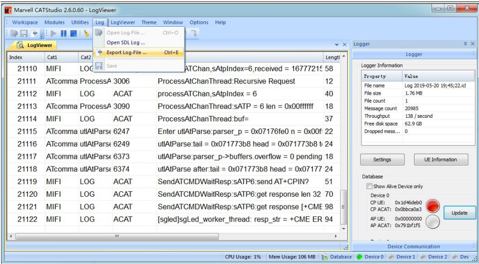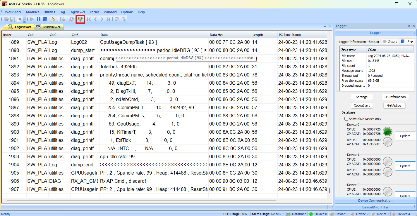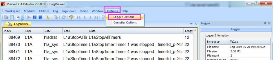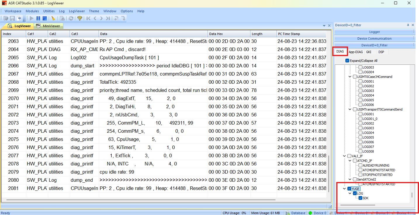 点击 Modules → LogViewer 后即开始抓取日志。之后再打开 CATStudio 工具默认打开 LogViewer,即打开该工具就开始抓取日志。