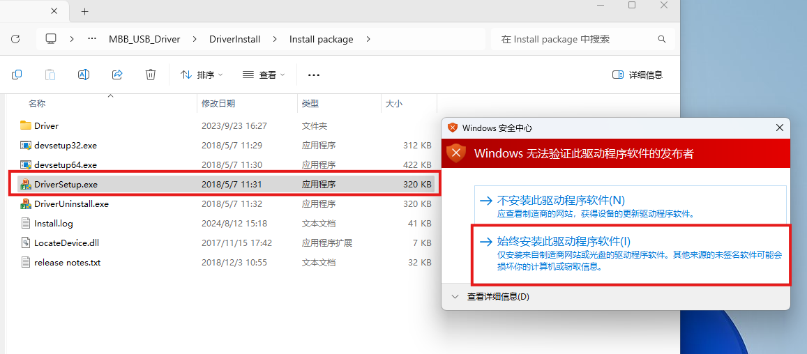 步骤 2 解压缩驱动文件,再解压 Install package.zip,双击执行:驱动文件夹中的 DriverSetup.exe;