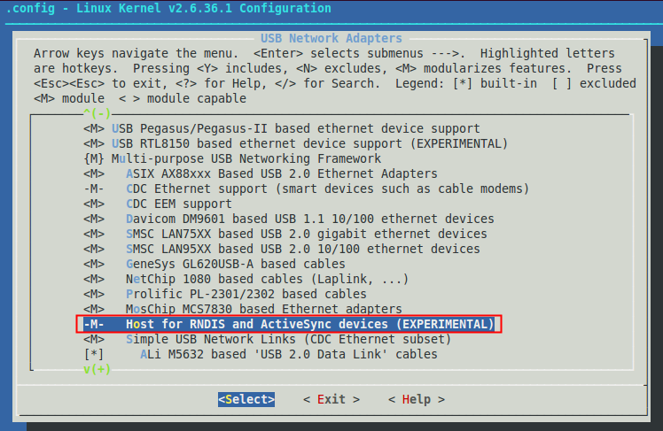 Device Drivers → Network device support → USB Network Adapters → Multi-purpose USB Networking Framework