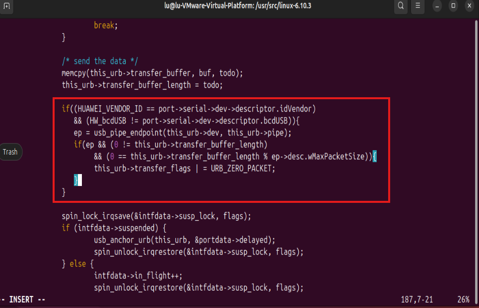 在usb_wwan_write 函数增加对零包的判断 增加部分如图所示:
