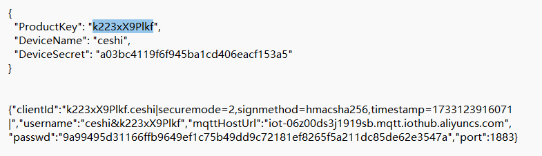 AT+MCONFIG=“k223xX9Plkf.ceshi|securemode=2,signmethod=hmacsha256,timestamp=1733123916071|”,“ceshi&k223xX9Plkf”,“9a99495d31166ffb9649ef1c75b49dd9c72181ef8265f5a211dc85de62e3547a”