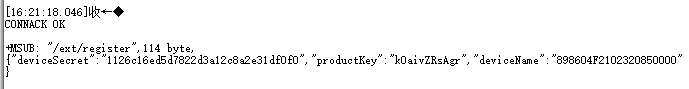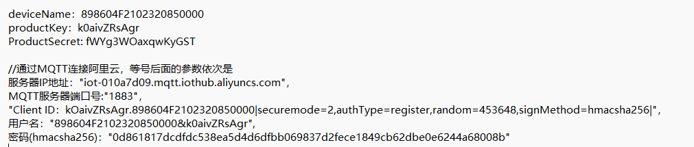 AT+MCONFIG=“kOaivZRsAgr.898604F2102320850000|securemode=2,authType=register,random=453648,signMethod=hmacsha256|”,“898604F2102320850000&k0aivZRsAgr”,“0d861817dcdfdc538ea5d4d6dfbb069837d2fece1849cb62dbe0e6244a68008b”