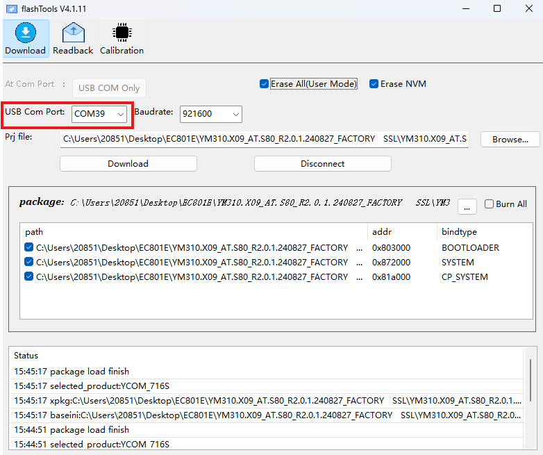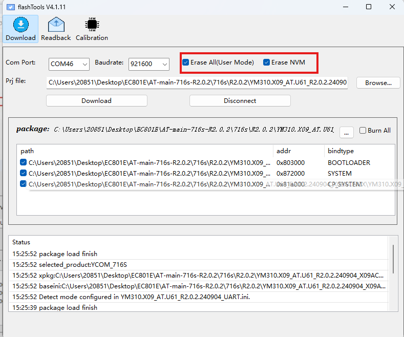 注意:FlashTools工具勾选下图两个会擦除NV和文件系统。不同项目下载最好勾选这个, NV可能差异的