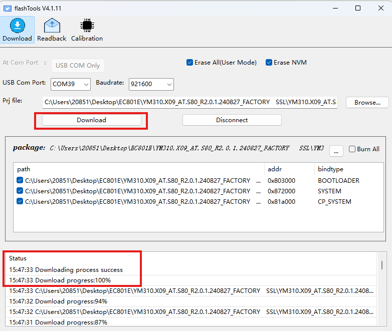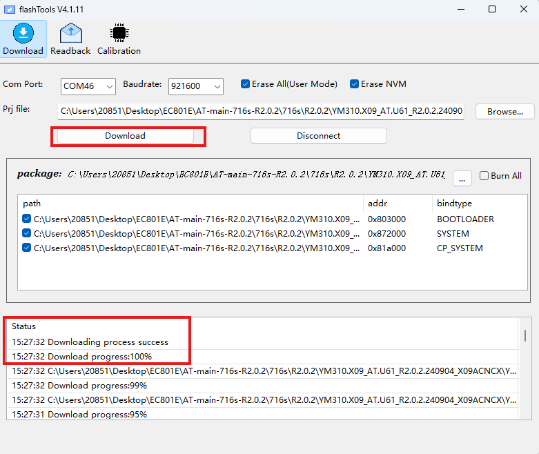 (注意:单模块需要处理usb_boot键接1.8V重启进入下载模模式,重启后工具会自动识别下载口)