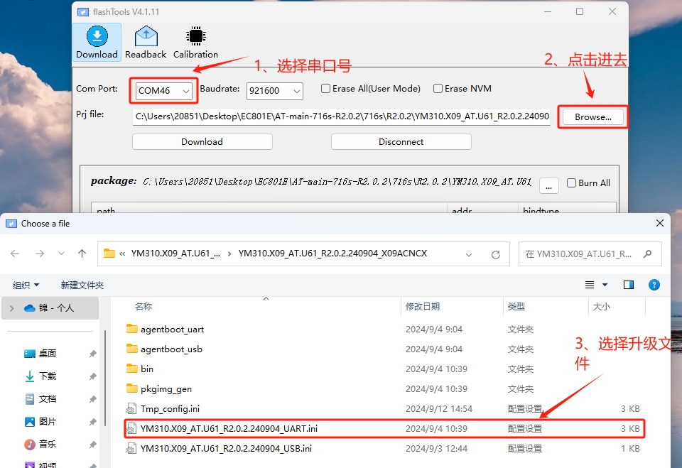 4、打开FlashTools工具选择模块升级文件(UART.ini结尾文件)